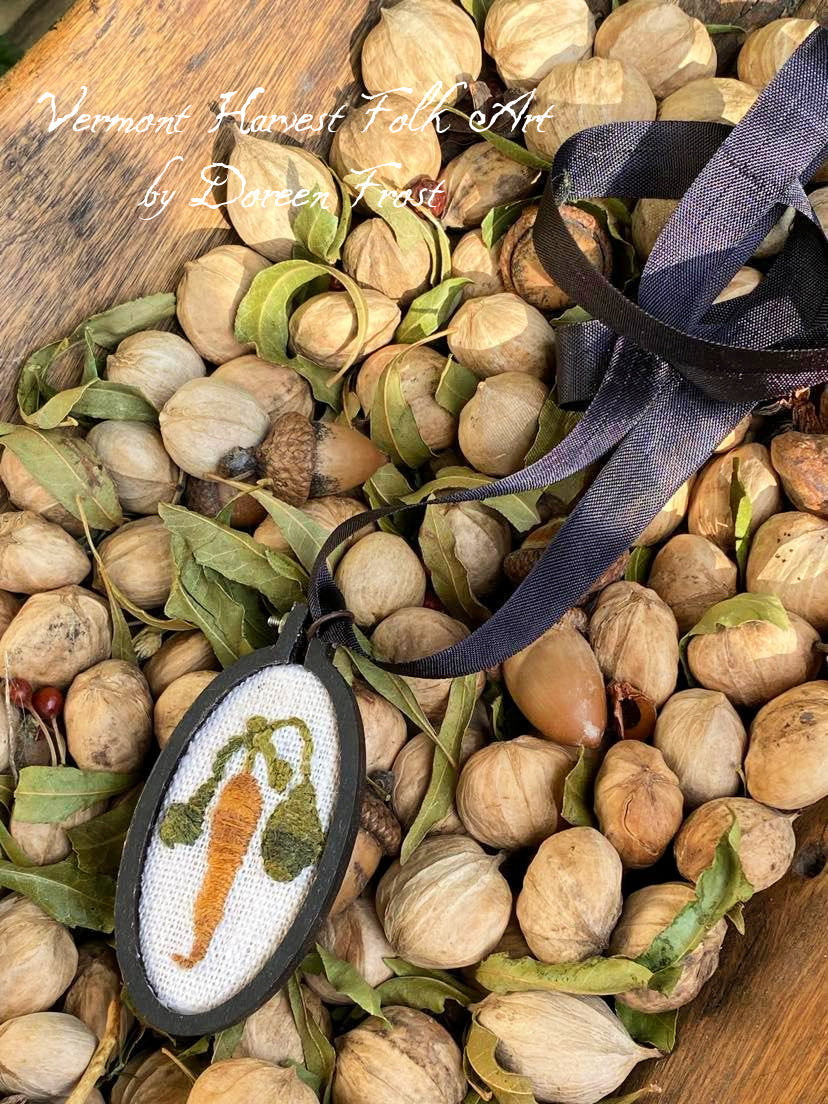 OH, I just LOVE these little pendants. I have embroidered each onto Blackberry Primitives Linen using Weeks Dye Works Floss in shades of green, orange and yellow. There are four pendents available, each comes strung on an 18" vintage black rayon ribbon. Each pendant is made from real wood.