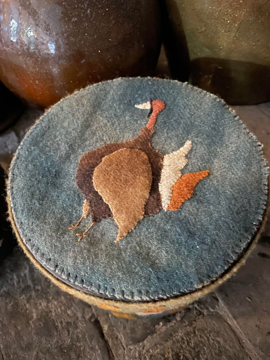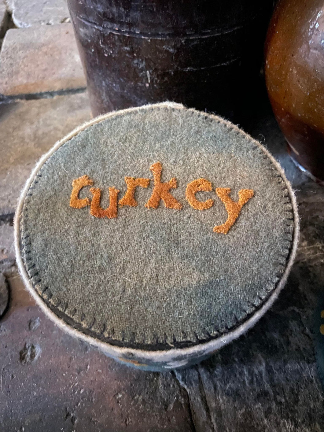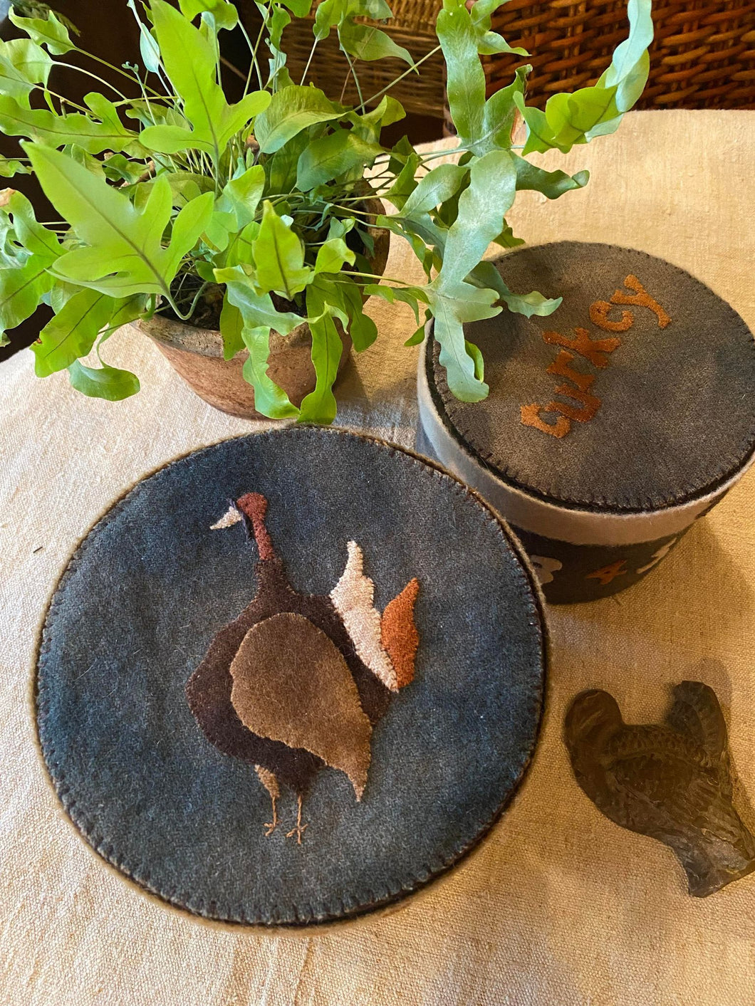 Two primitive wool-covered boxes reminiscent of an antique children's primer, featuring my favorite animal, THE TURKEY, along with colorful letters and numbers.