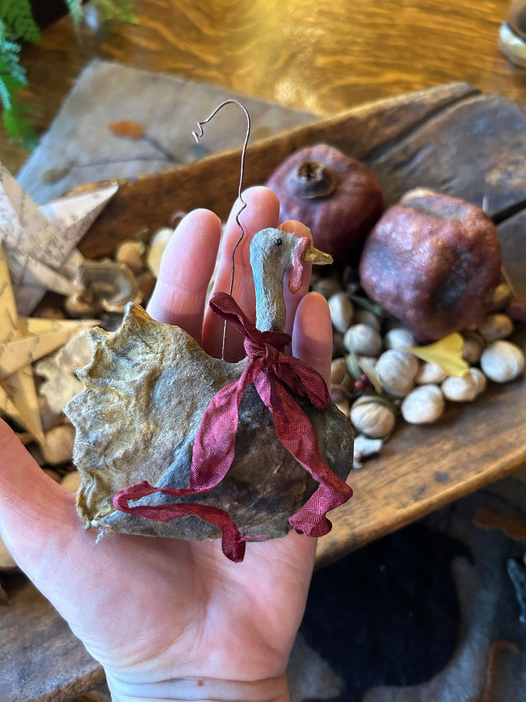 I begin each turkey by sculpting an armature from paper clay.  I then add layers (and layers) of spun cotton.  Each one is then hand-painted and aged, for a time-worn look and feel.  Each one has tiny black glass eyes and a vintage aged red ribbon.  The ribbons are removable, should you not care for them.  Each turkey measures approximately 5" and includes a twirly wire hanger (they measure approx 6- 6 1/2", including their hangers).  Each will come with its own box, neatly and safely packaged so they can be treasured year after year.