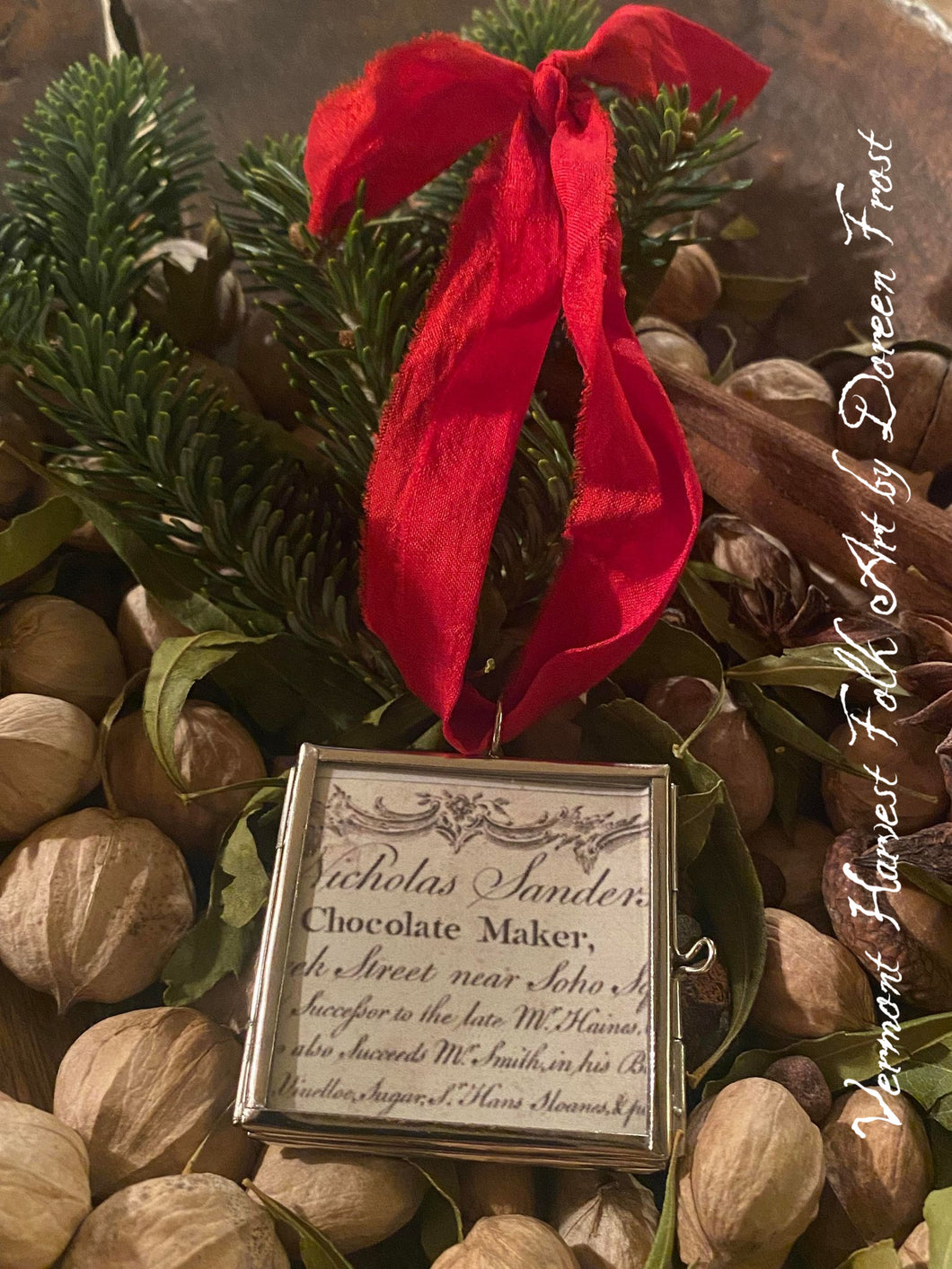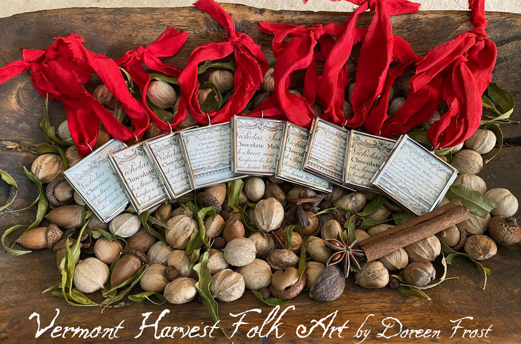 I LOVE THESE!! I have taken lovely silver soldered frames and placed olde ad graphics inside. The ad is done on aged paper and written in a gorgeous script. I think the words Nicolas Sanders ~ Chocolate Maker, is just perfect for Christmas. As is the lovely red Sari Silk ribbon I have added to each. Ornaments are the same on both sides. As I well know, ornaments tend to turn when you place them on your tree branches so I wanted to be sure these lovely ornaments looked wonderful however they chose to turn. :)