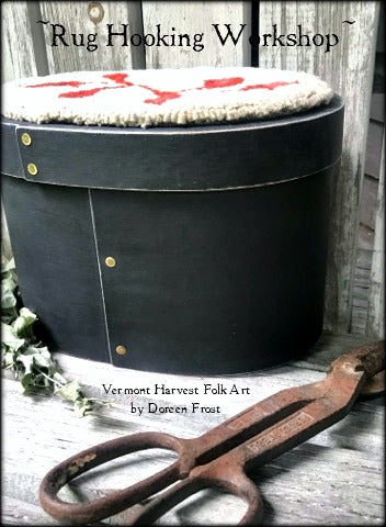 I've hooked this piece with hand dyed wool in a lovely oatmeal and olde barn red. It sits atop a gorgeous wood box that I've painted black, inside and out, then sanded and waxed the entire thing. It makes a lovely keepsake box for your treasures or sewing supplies :).
