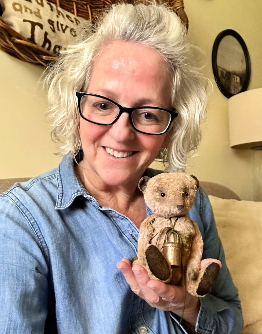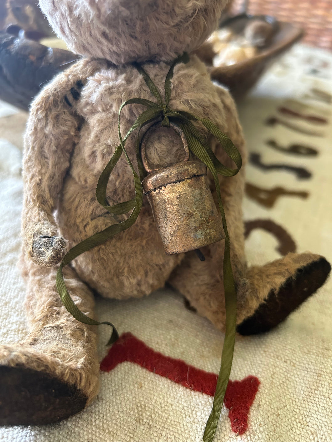 Olde Thomas is a rich latte color with antique black wool foot pads, black glass, shoe button, eyes and a thread nose.  I have plucked and aged him for and olde, well worn, and well loved, appearance.  I've added a few "repair stitches" for a bit of a mended look. :)  He is stuffed with excelsior, wool batting, sawdust and some glass beads for weight.  Around his neck he wears a vintage sheep bell tied with a hand dyed (by me) silk ribbon.