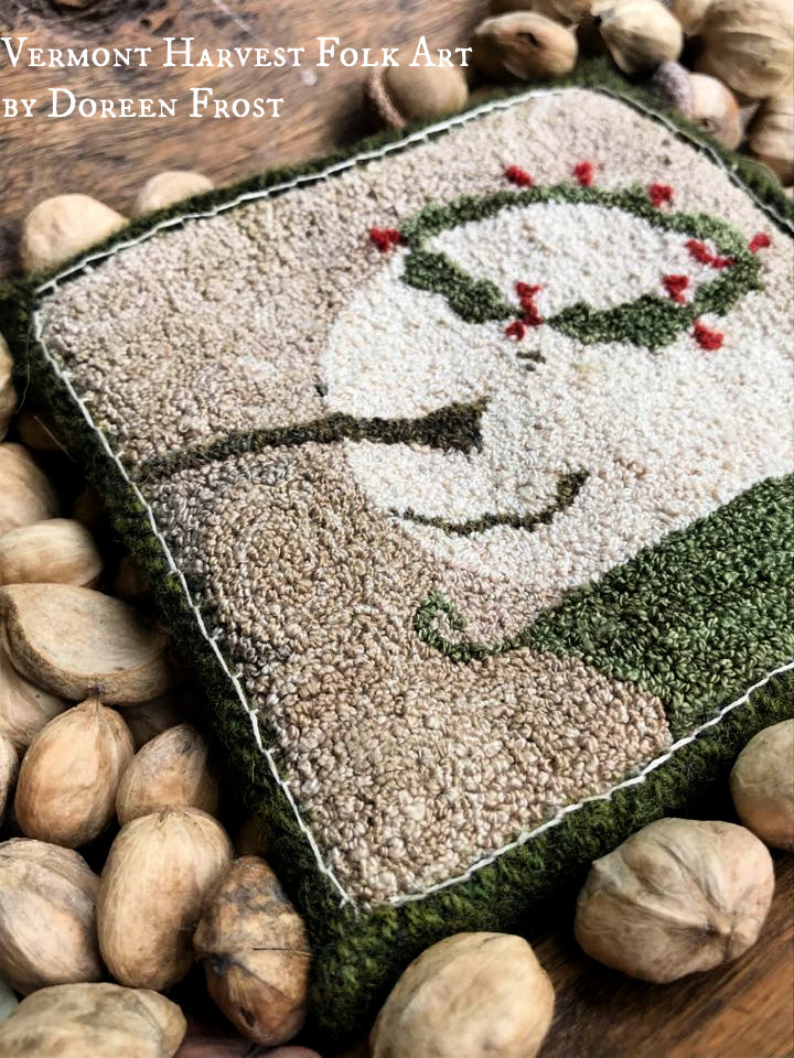 Each coaster was punched by me, using Valdani perle cotton threads in lovely seasonal colors. You'll find a frosty snowfolke, sitting in an urn, donning a yuletide wreath, an olde Urn filled with Spring flowers paired with two sweet birds, a summer strawberry atop and olde Urn and a prize winning Autumn pumpkin sitting atop an Urn (I love URNS). Each coaster is finished with hand dyed wool that I've blanket stitched the punched piece too, creating a lovely framed border and decorative finish. I love those pointy little corners.. :).