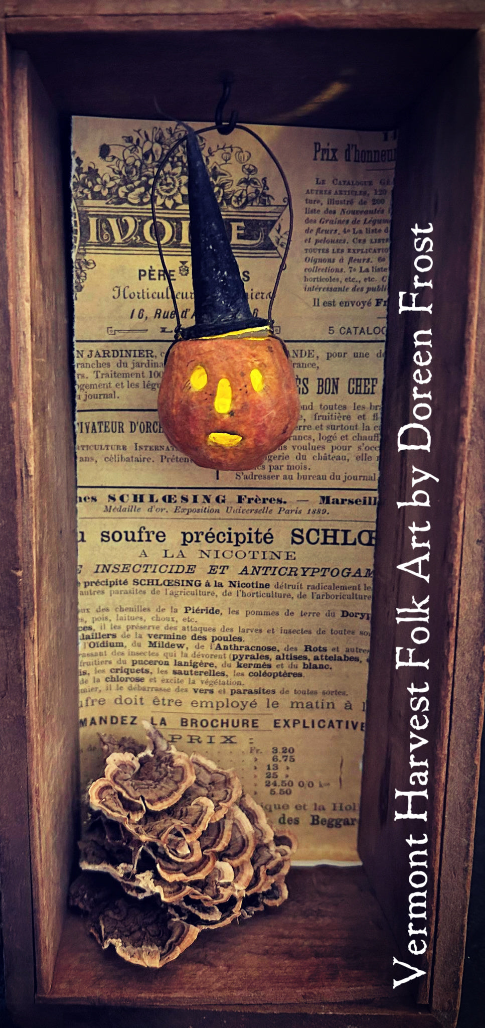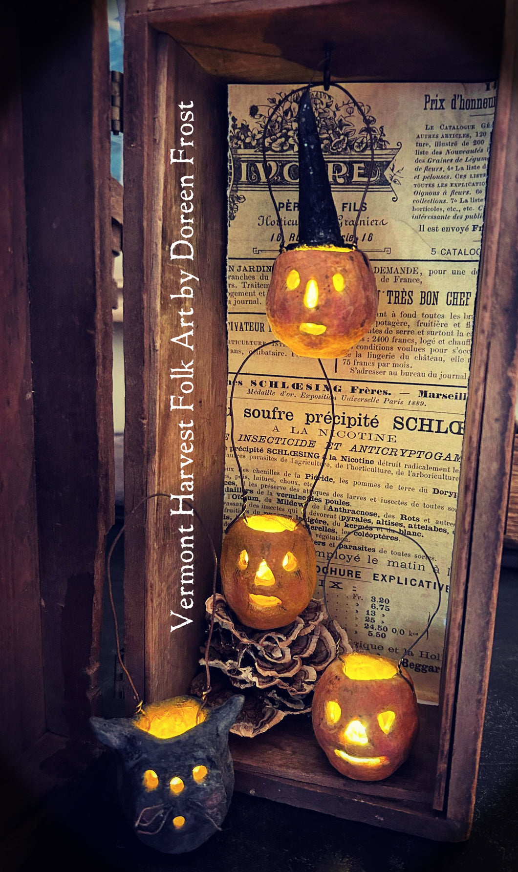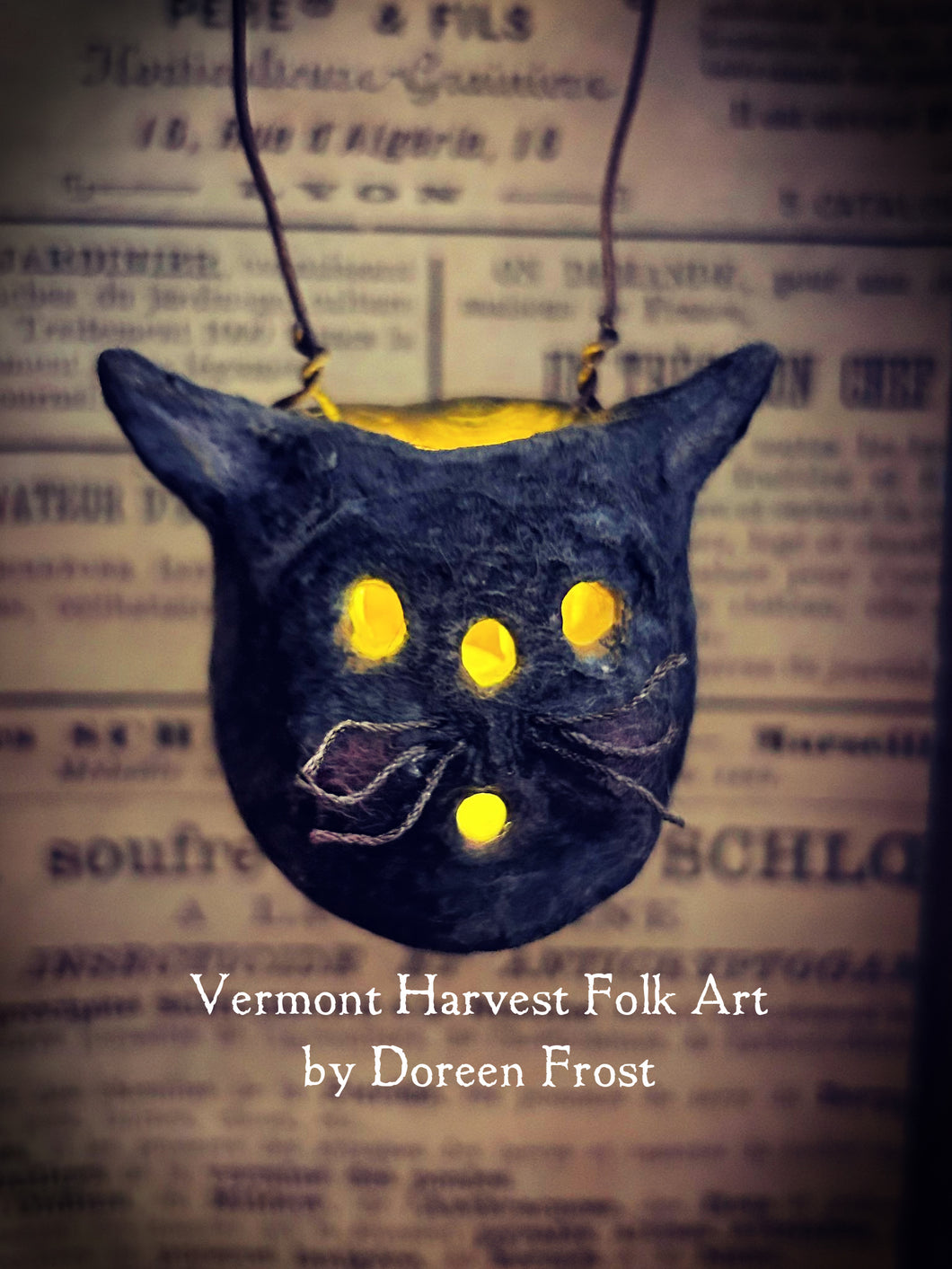 Today I offer you three spun cotton Jack~O~Lanters and one spooky Black Cat~O~Lantern. Each one is made beginning with a paper clay base to which I then applied several layers of cotton. Once dry I painted each one, inside and out, and gave them lots of character. They are purposely made to look old and worn ~ much like antique spun cotton ornaments of the past. Each one is hung from rusty wire and will come with two little balloon lights. One of the Jacks has a removable spun cotton witches hat. :). The spooky kitty has antique wire thread whiskers :). He's just so cute. Well, they all are actually.