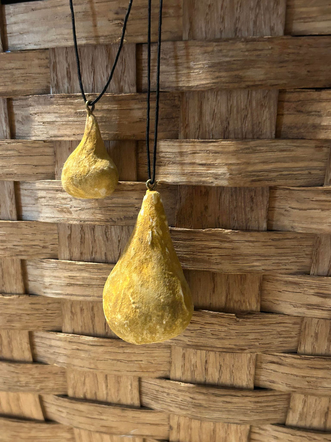 Spun Cotton Pear ~ Two are available. One large, measuring approx. 1" wide by 2" long, with 42" black vintage cording. The small measures approx. 1/2" wide by 1" long with approx. 24" of vintage black cording.