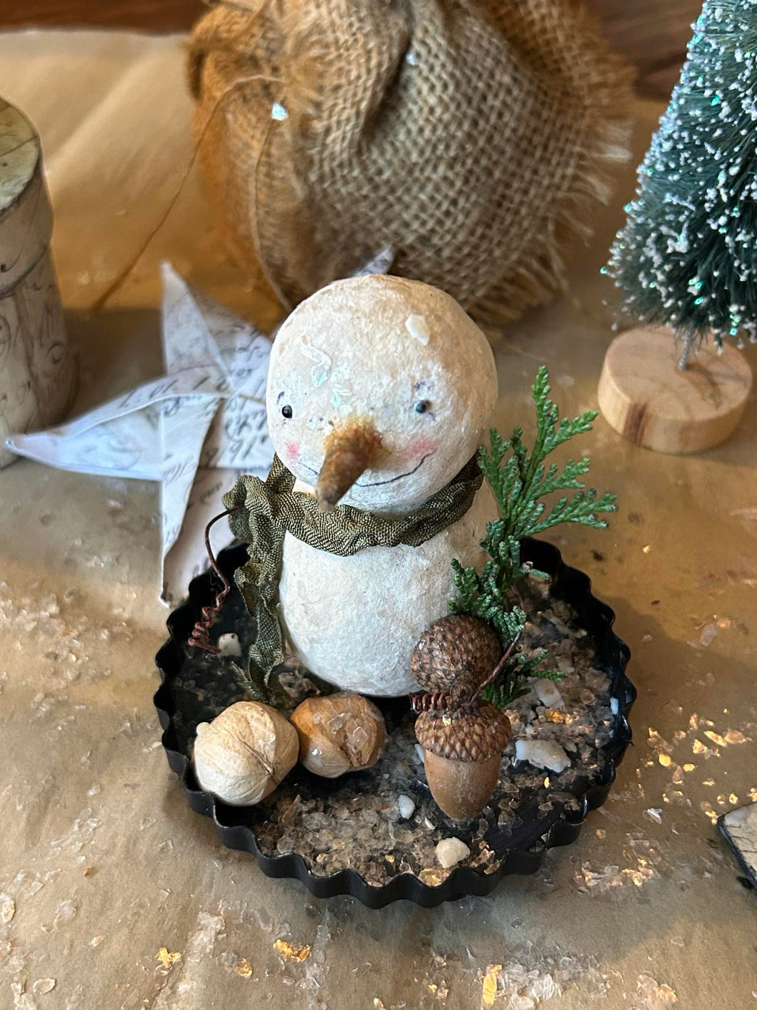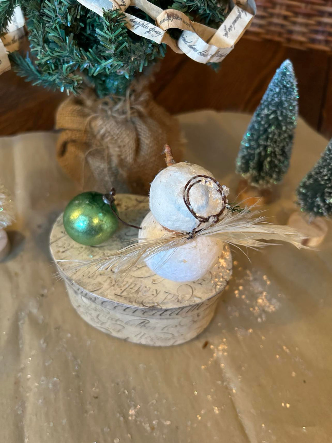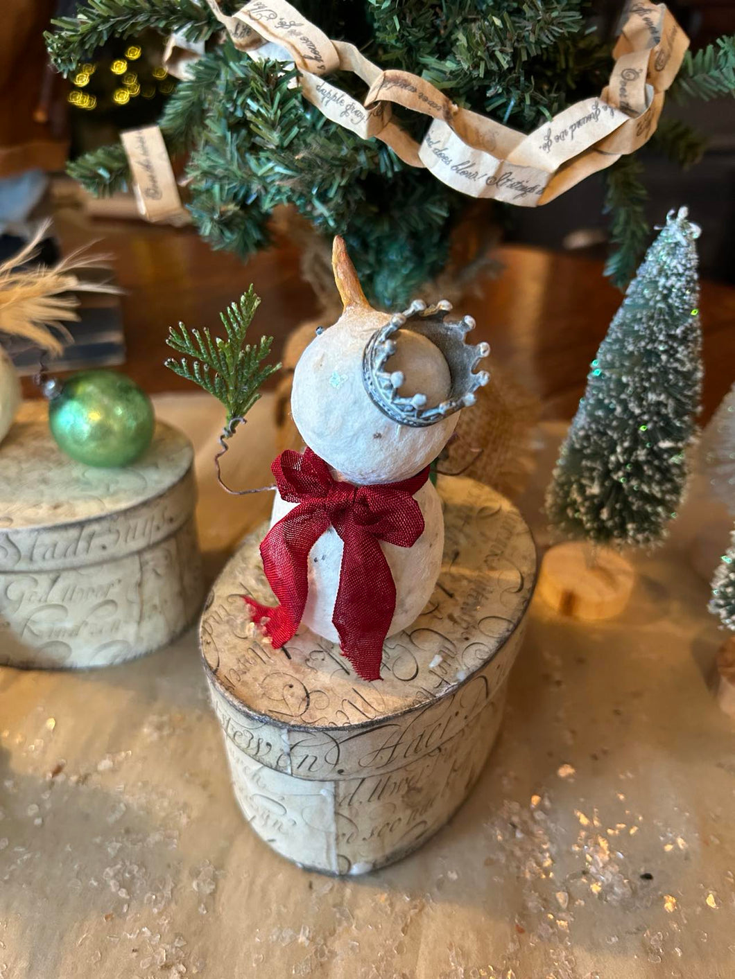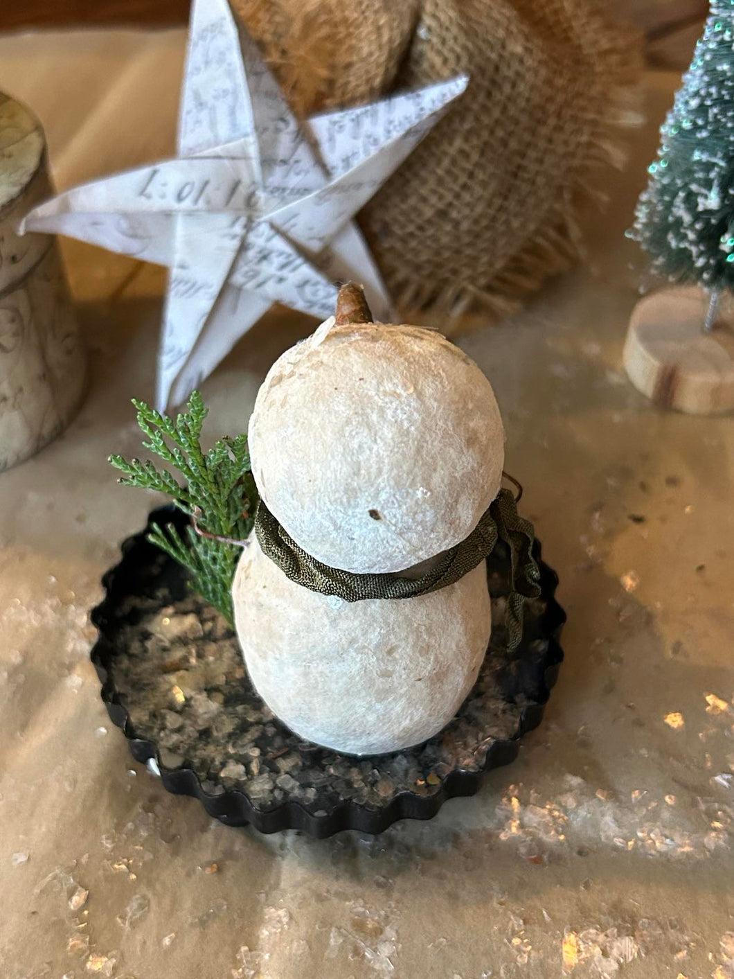 Once I have created the shape, I then paint each one lightly, adding sweet little hand-sculpted paper clay noses and black glass eyes. and twirly twig-like wire arms. Each one is unique and features its own little touches and embellishments such as antique ribbon scarves, tiny antique mercury glass bulbs, glass button beads, vintage tinsel collar, feather wings, an aged crown, little sprigs of cedar, an acorn, and hickory nuts, from our property. Three of the snowfolke sit atop aged paper mache boxes that I have covered with aged and waxed paper. Each box is painted and waxed inside as well. One little fellow is inside a little painted metal and plastic dome. and one little fellow sits on a thin wooden square that I have covered with aged paper and waxed.