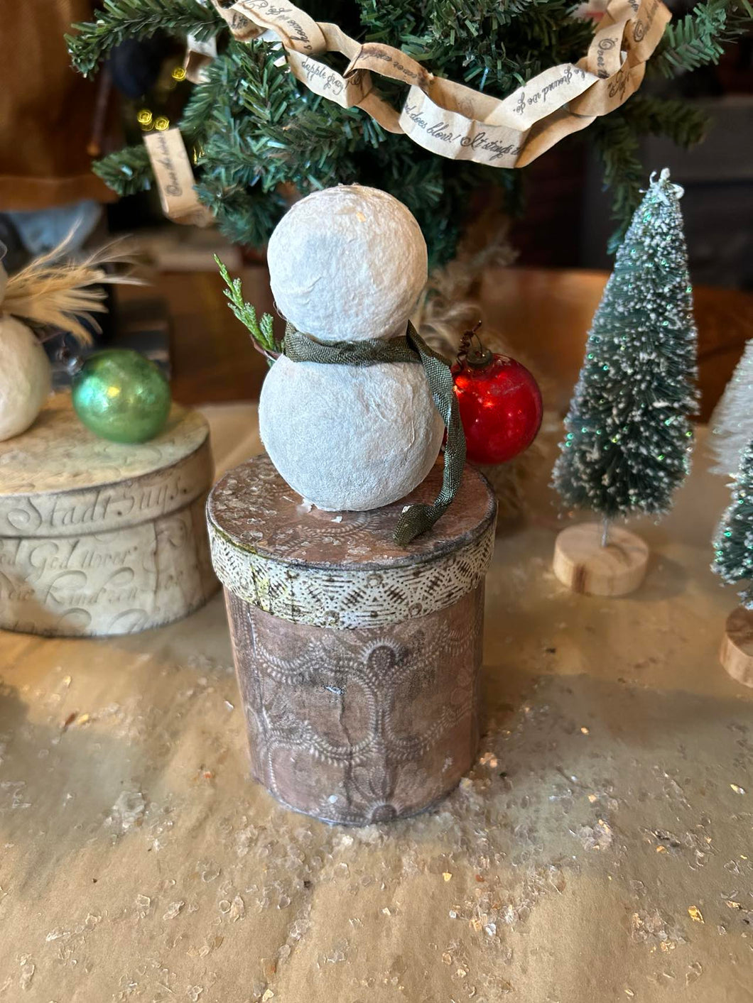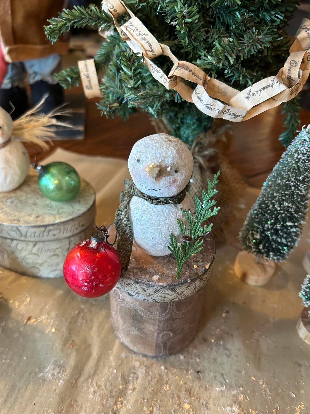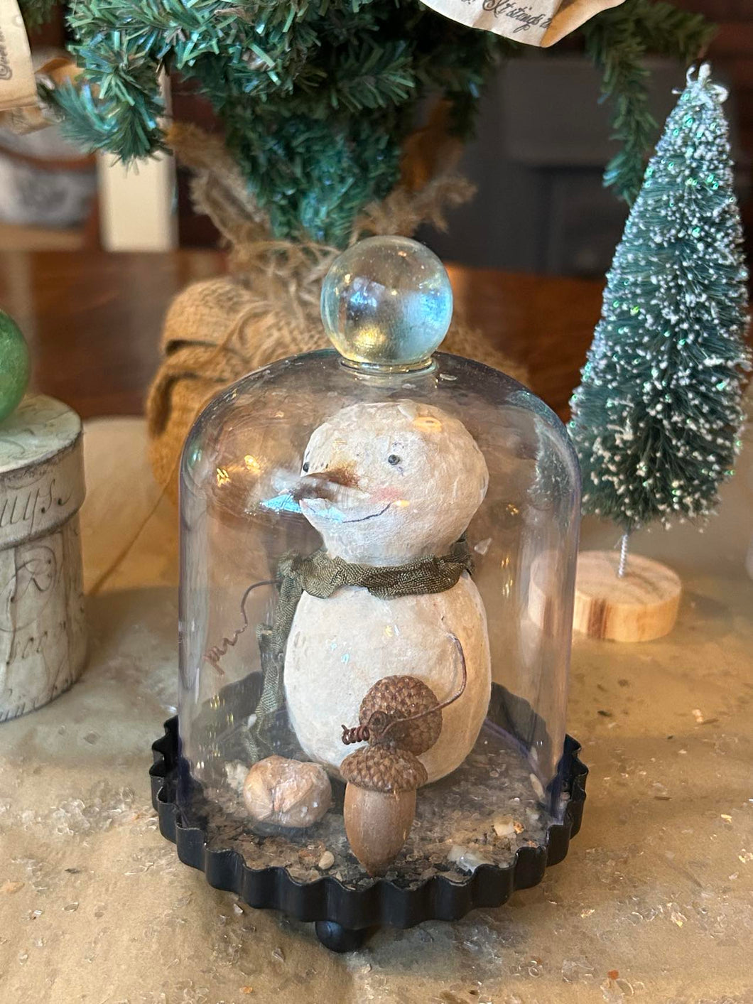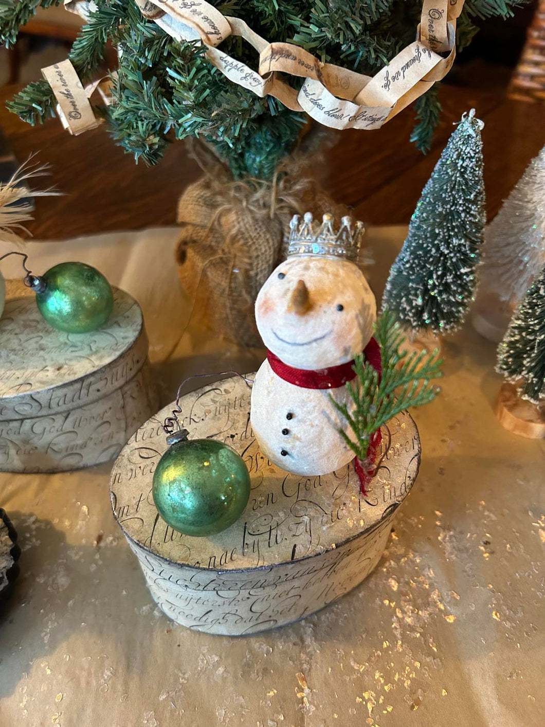 Once I have created the shape, I then paint each one lightly, adding sweet little hand-sculpted paper clay noses and black glass eyes. and twirly twig-like wire arms. Each one is unique and features its own little touches and embellishments such as antique ribbon scarves, tiny antique mercury glass bulbs, glass button beads, vintage tinsel collar, feather wings, an aged crown, little sprigs of cedar, an acorn, and hickory nuts, from our property. Three of the snowfolke sit atop aged paper mache boxes that I have covered with aged and waxed paper. Each box is painted and waxed inside as well. One little fellow is inside a little painted metal and plastic dome. and one little fellow sits on a thin wooden square that I have covered with aged paper and waxed.