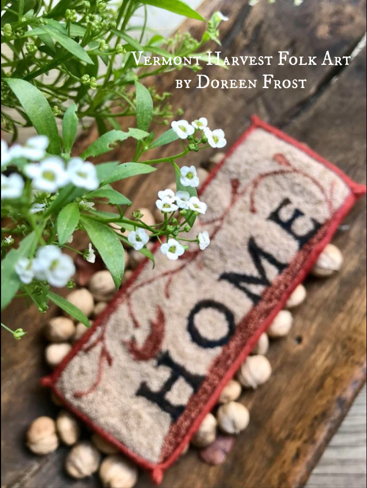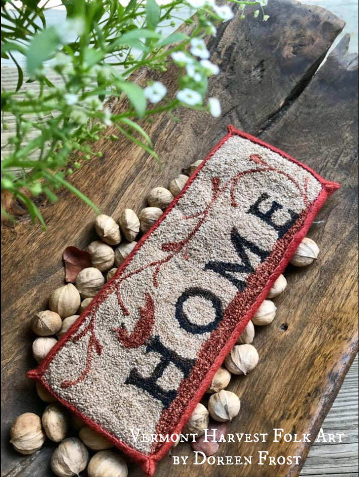 Each piece is finished with hand dyed "brick" wool. The WELCOME piece features a lighter version and the HOME piece features a darker version.