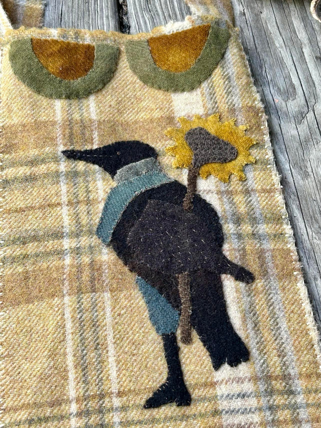 This hand stitched wool applique' pocket is made of a muted yellow plaid with notes of green, tan and cream. On the front of the pocket, I have stitched a dapper crow (Mr. Sanderson) in tones of black with smart Indigo pants, collar and scarf. He holds, for his sweetheart beautiful golden sunflower. On th etop and bottom of the pocket I have stitched half pennies in a mossy green and rich golden brown.