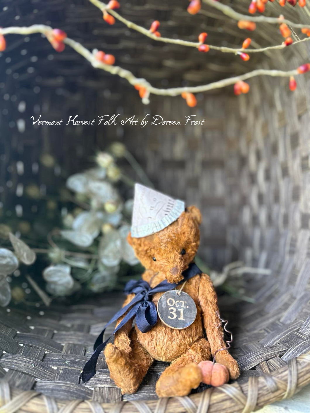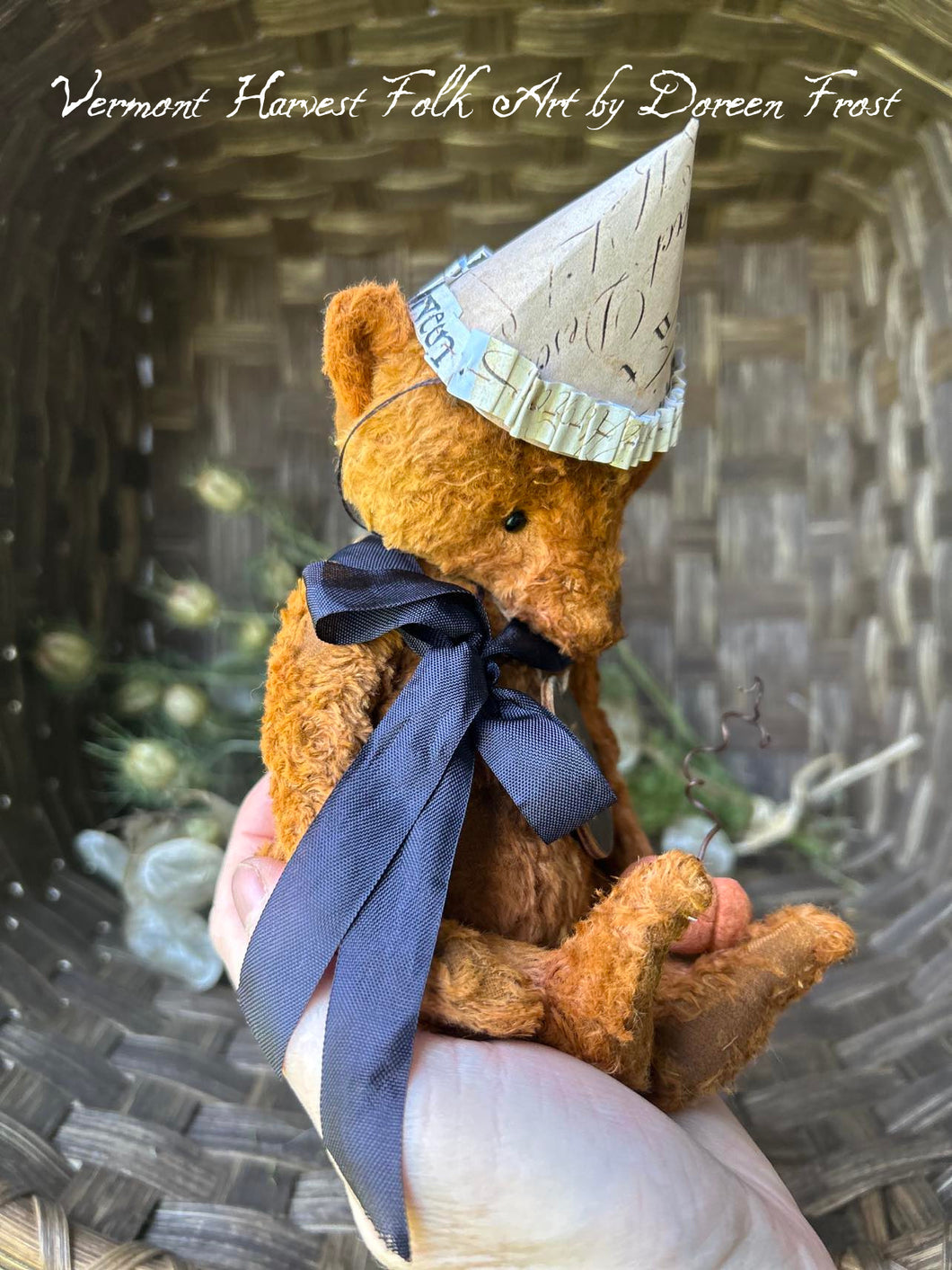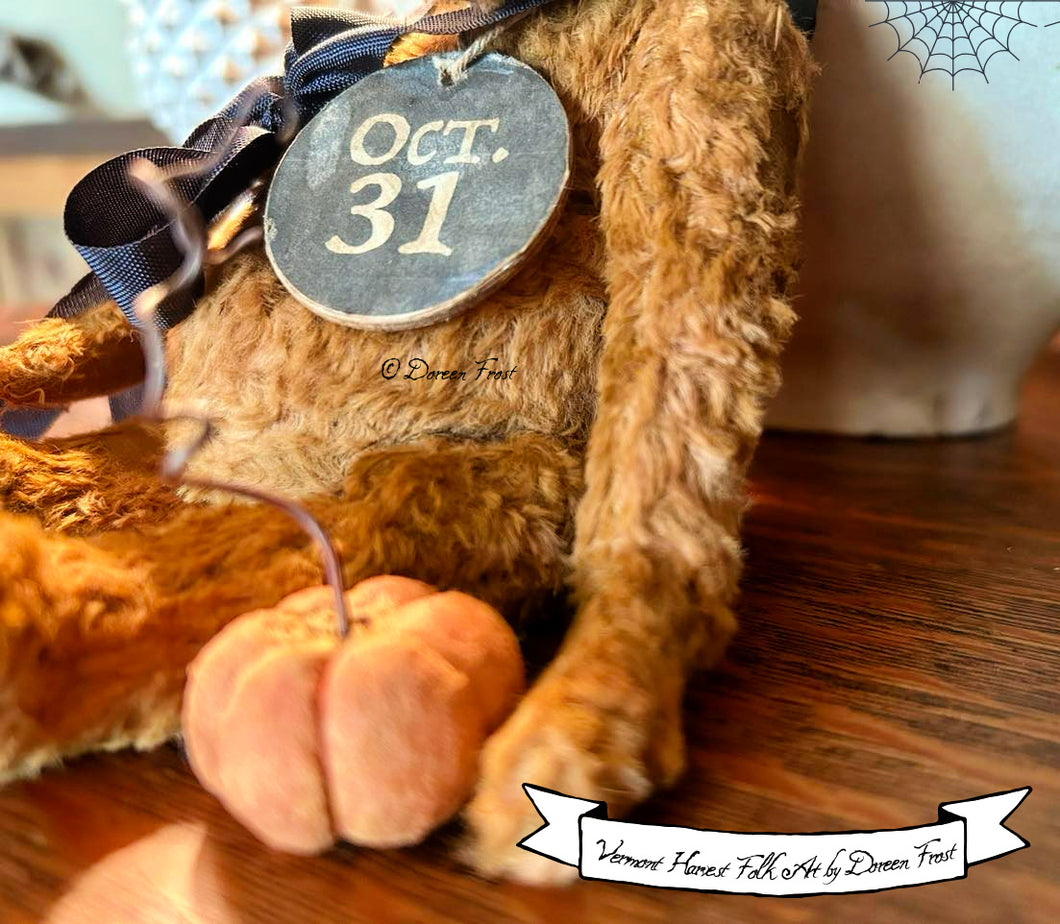 Emmet is made from German Viscose that I have hand dyed a gorgeous spicey pumpkin. He is stuffed with sawdust, excelsior, and glass beads for a nice soft and squishy feel. He has been aged heavily, and I have added a few thread repair stitches here and there for that well loved look. He had a thread nose and shoe button eyes. He wears an aged paper hat, a vintage black ribbon, and my signature wooden hang tag. He is accompanied by a tiny spun cotton pumpkin with a little grapevine twig stem.