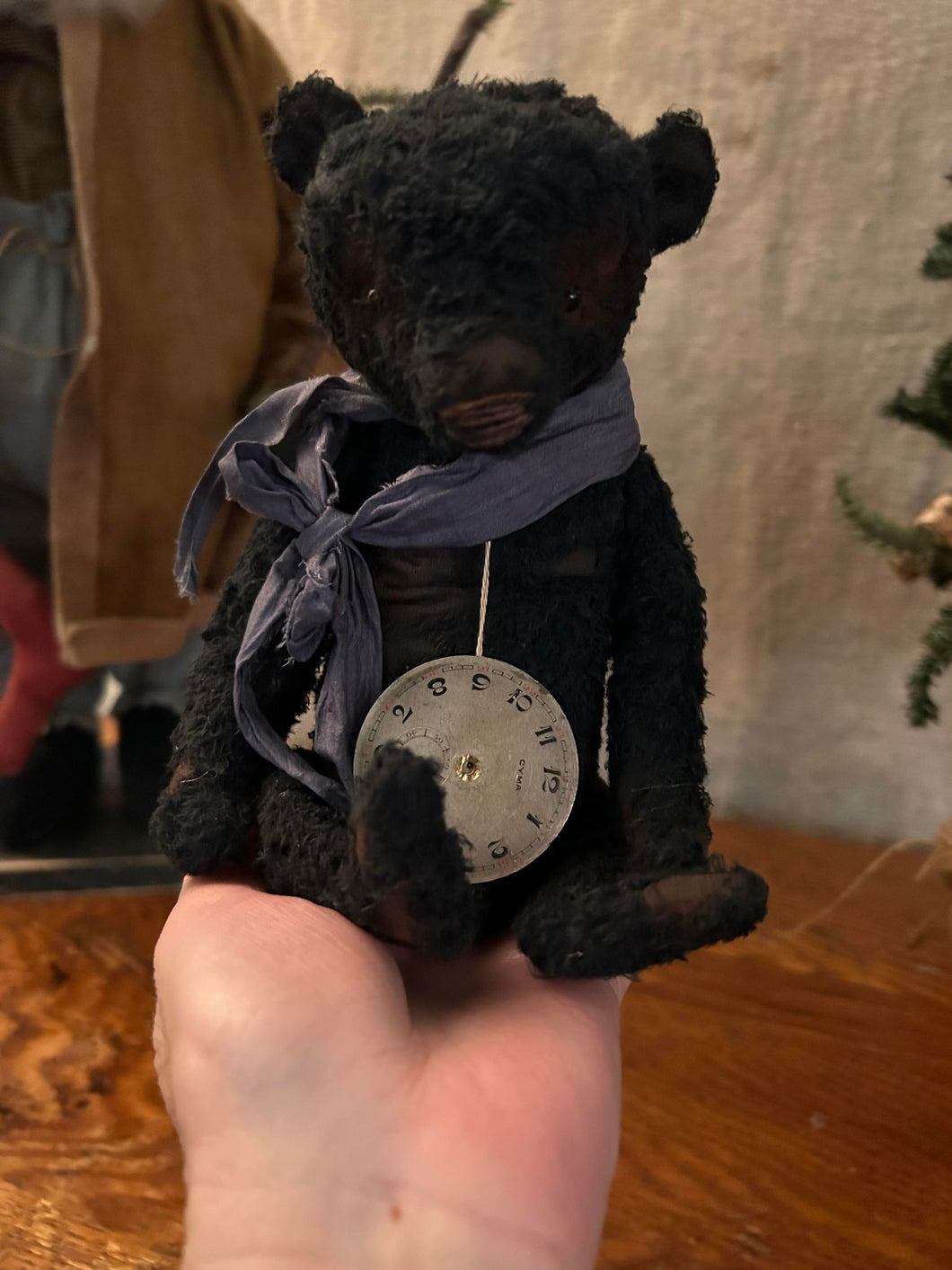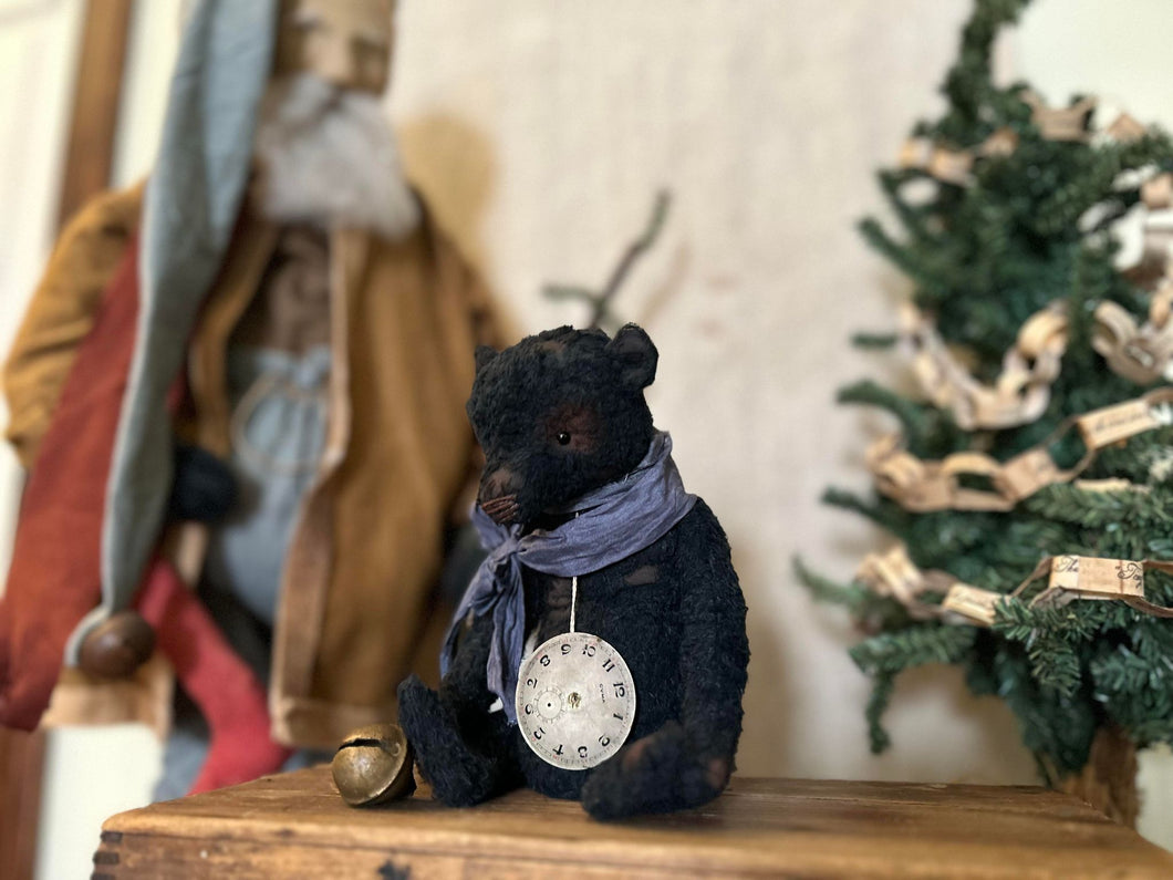 This sweet little bear is made from sparse black mohair and wears a vintage dusky grey ribbon and an antique pocket watch face.  He measures a wee 9" and is weighted and squishy so he will sit nicely in your hand.