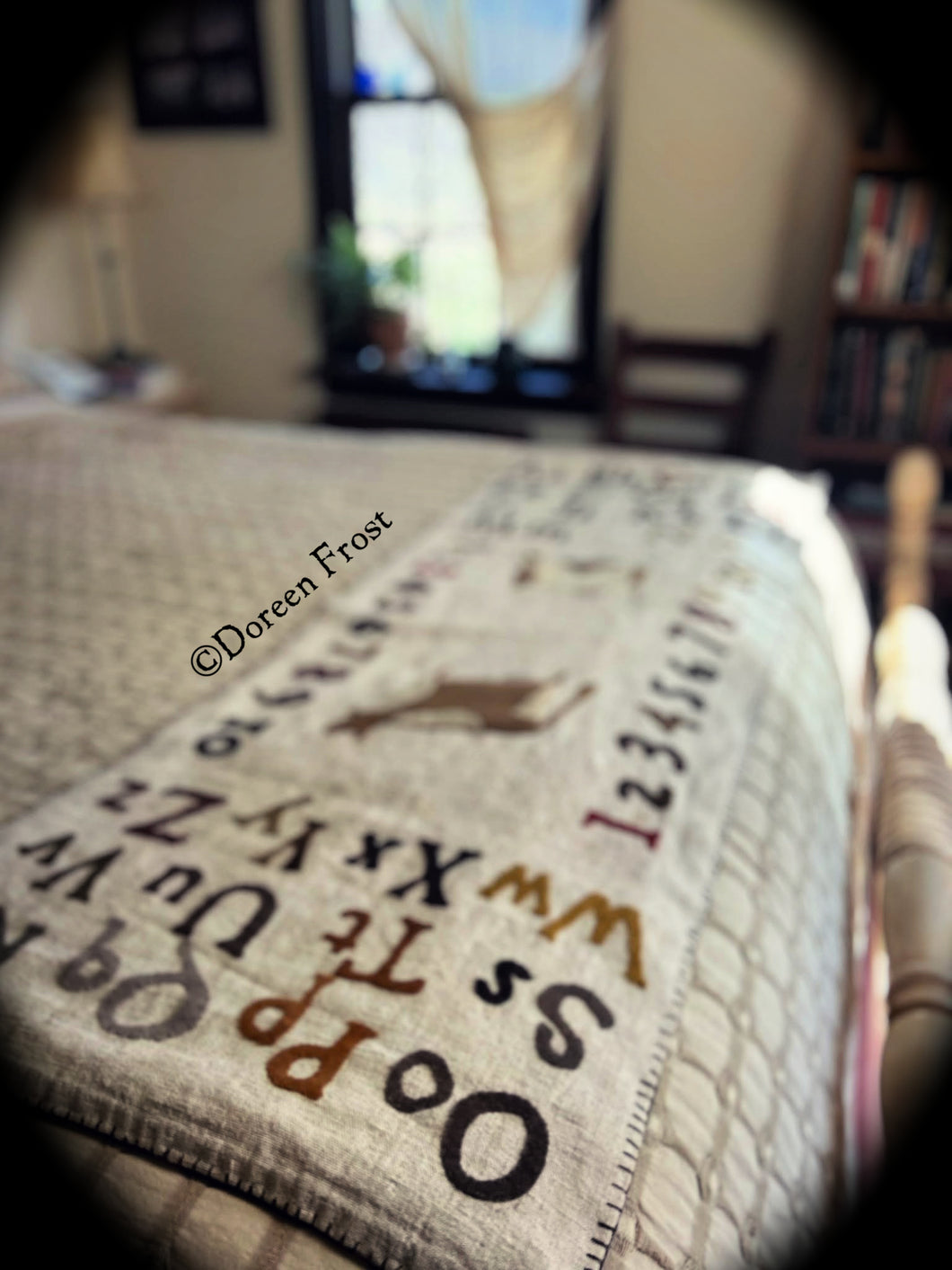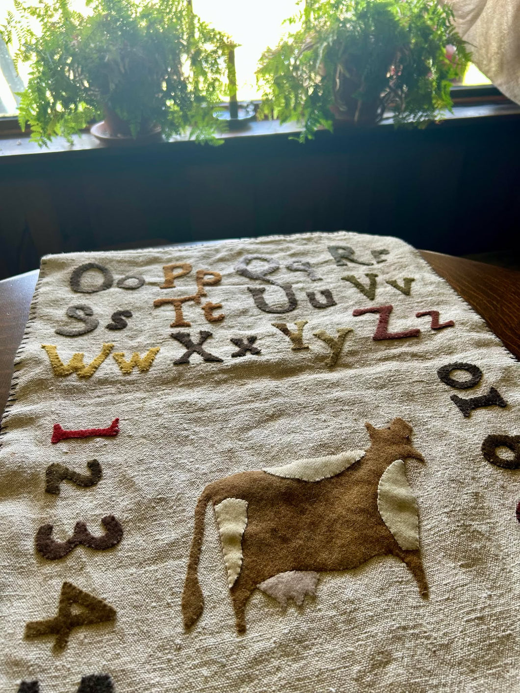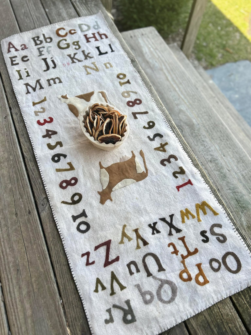 A large and lovely table runner featuring my favorite things to stitch....letters and number along with two lovely Vermont Cows.