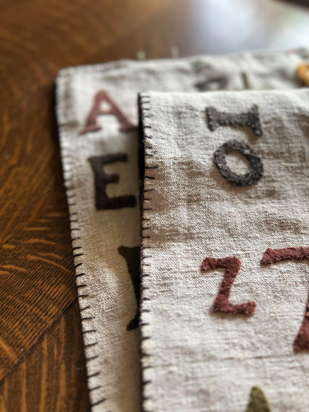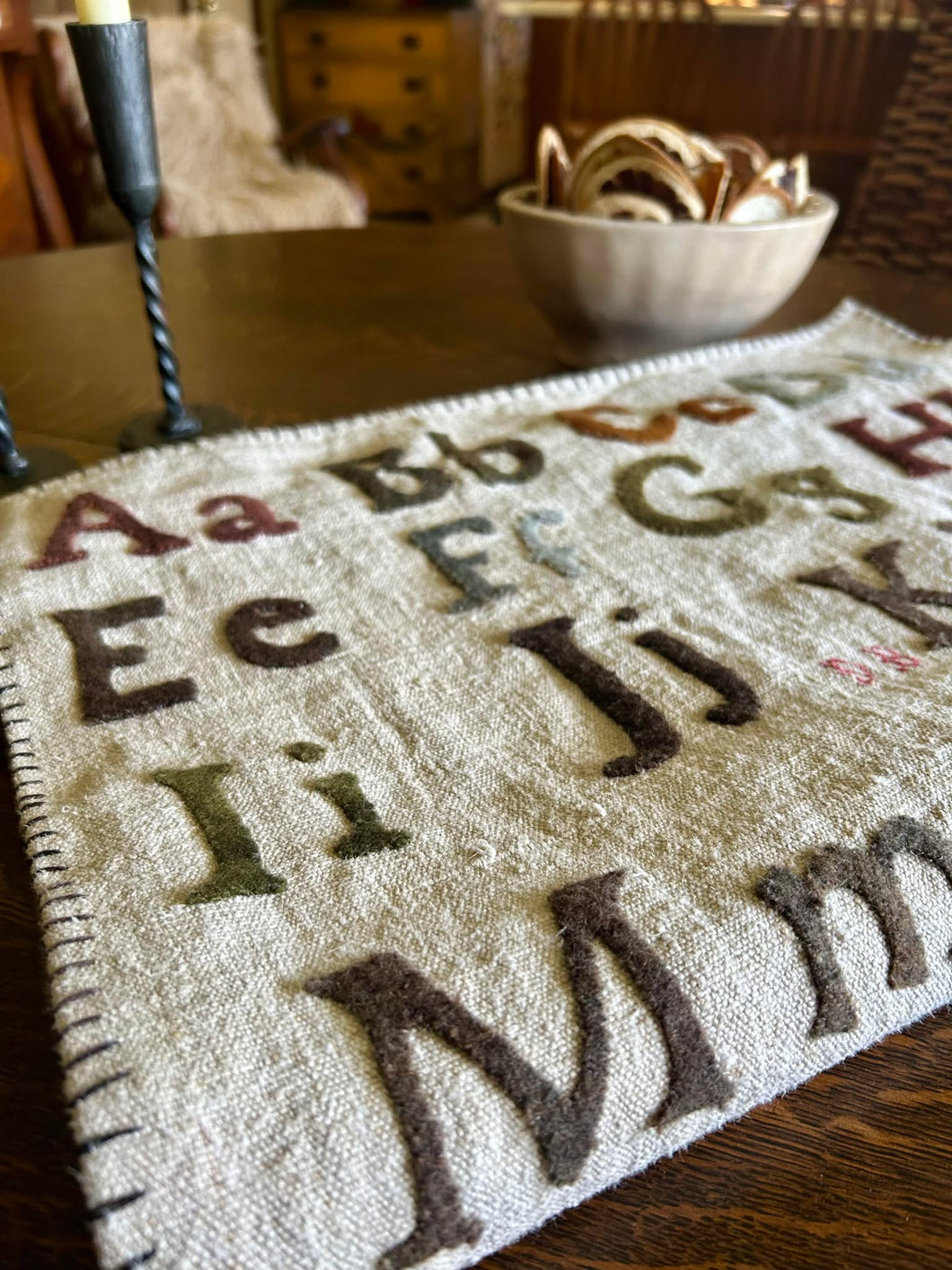 OF NOTE....I used lots of different wool colors (all Blackberry Primitives wool) for the letters and numbers in this project because I pulled them all from my scrap basket. Feel free to do the same. If you do not wish to purchase SO many colors, feel free to change the colors and use your favorites. I give a full list of the colors I used, in the materials list, if you wish to use the same:). THE BACKGROUND is a piece of antique French Olive sack (purchased on Etsy). You are welcome to use whatever you like. For a similar look, search for feed sack yardage, or a blend of linen & cotton OR linen & hemp. I found a shop on Etsy (CottageDesigns) that carries feed sack yardage in a lovely cream that would be great. Blackberry Primitives linen would work wonderfully here as it has a nice weight to it, similar to the weight of my background.