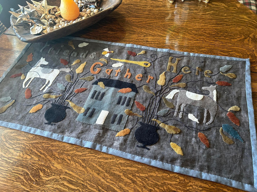 A primitive wool applique table runner. Finished size 17" x 34"
