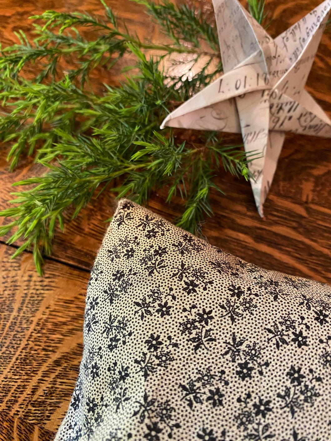 The design is made from Blackberry Primitives hand-dyed linen and textured wool with a bit of visible mending and a cotton patch or two. The topper is stuffed with wool roving and finished with an aged quilt shop cotton backing.