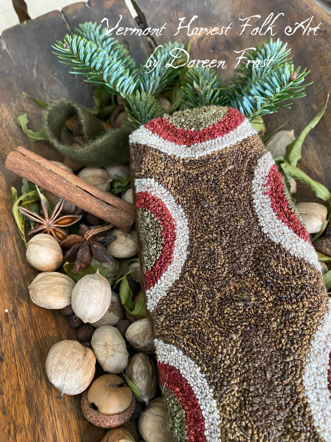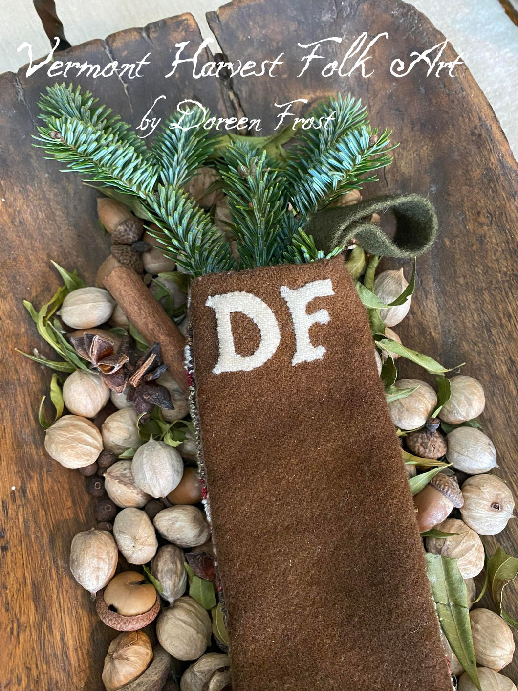 One of my absolute favorite designs ever.  A wonderfully olde and worn (looking) Colonial Christmas stocking. Made from Valdani Perle cotton threads in warm brown, cream, green, and red.  I have added a hand-dyed brown wool back and stitched my initials from lovely cream wool.