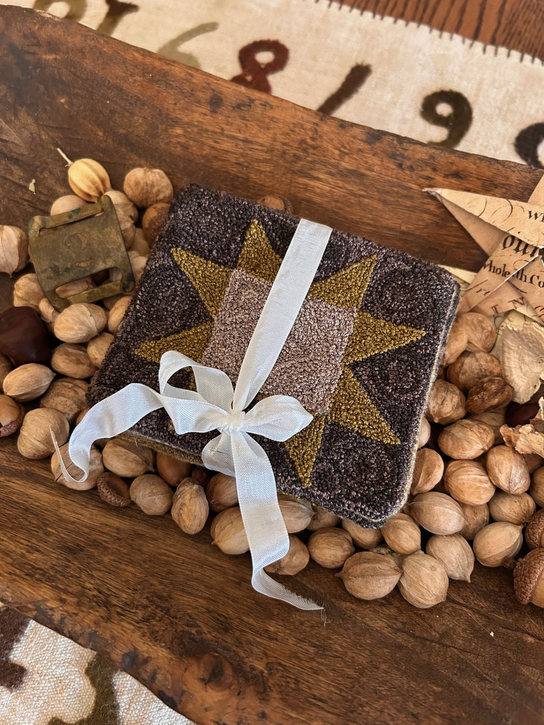These blocks can be finished in a wonderful array of ways. Within the pattern I have written directions to finish these with a wool backing which you can then use as coasters or perhaps frame them individually or together in one large frame. You could also stitch the blocks together vertically, or horizontally, and use as a wall hanging or stich the blocks onto linen bags or totes...the possibilities are endless.