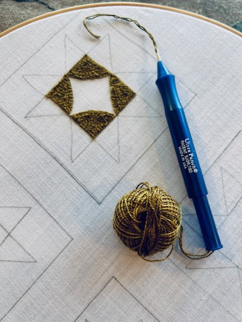 Four lovely, punched quilt blocks made with Valdani Perle Cotton in my favorite colors of brown, green and cream. Each block measures 4" x 4 1/2".
